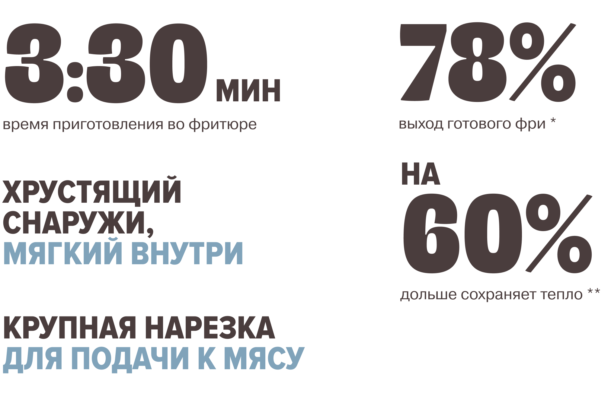 ** по сравнению с картофелем фри без панировки 9×9 мм, по результатам лабораторных тестов WE FRY