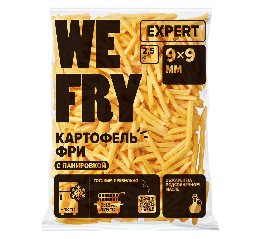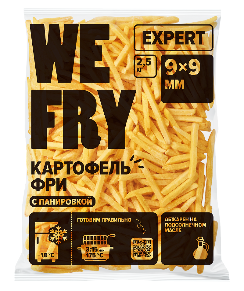 ** по сравнению с картофелем фри без панировки 9×9 мм, по результатам лабораторных тестов WE FRY