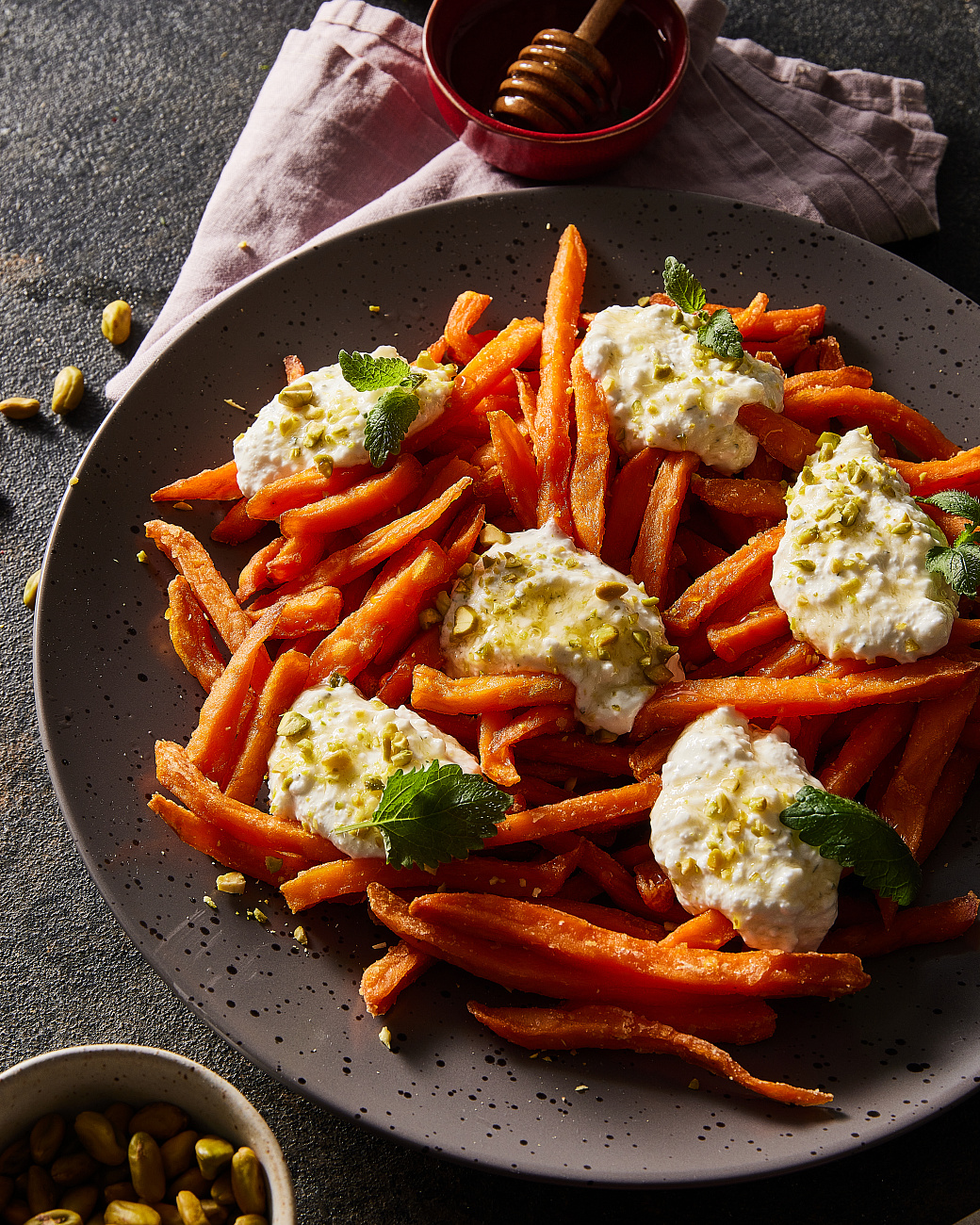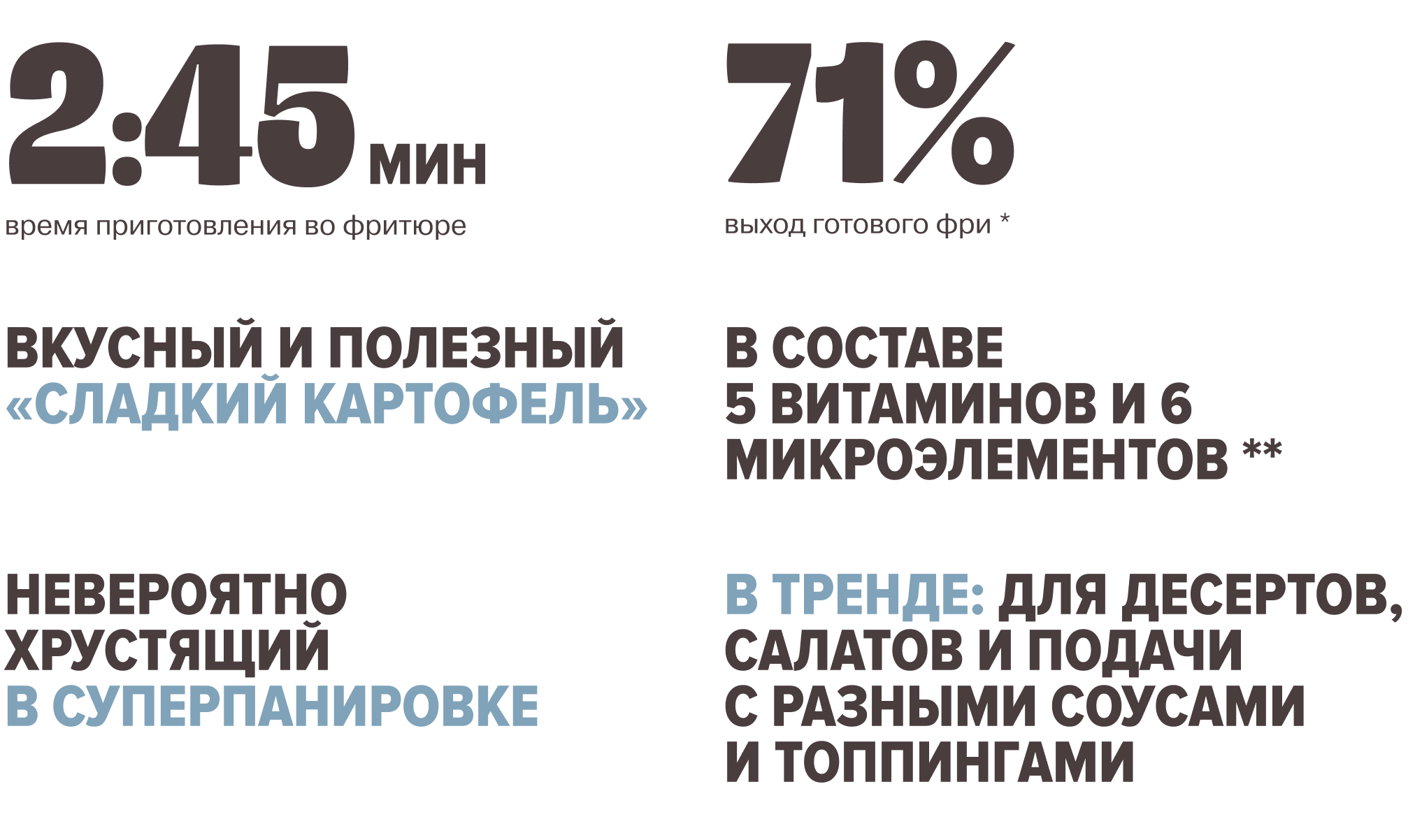 С лёгкой сладостью и золотистой корочкой, батат фри отлично работает как гарнир, десерт, смелая основа для авторских блюд. Внутри — 100% натуральный батат, содержащий полезные витамины и микроэлементы. Настоящий трендовый продукт — советуем добавить его в меню прямо сейчас!