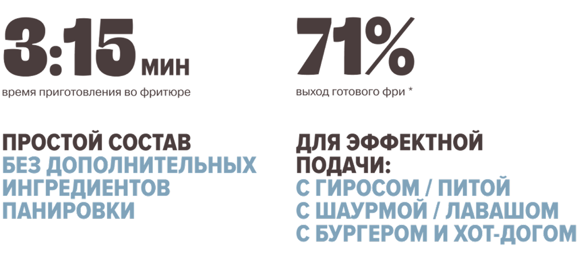 Классика, актуальная во все времена, для любого меню — соломка фри без панировки, в более крупной нарезке. Любимый картофель и ничего лишнего: только та самая хрустящая корочка и нежная текстура внутри.