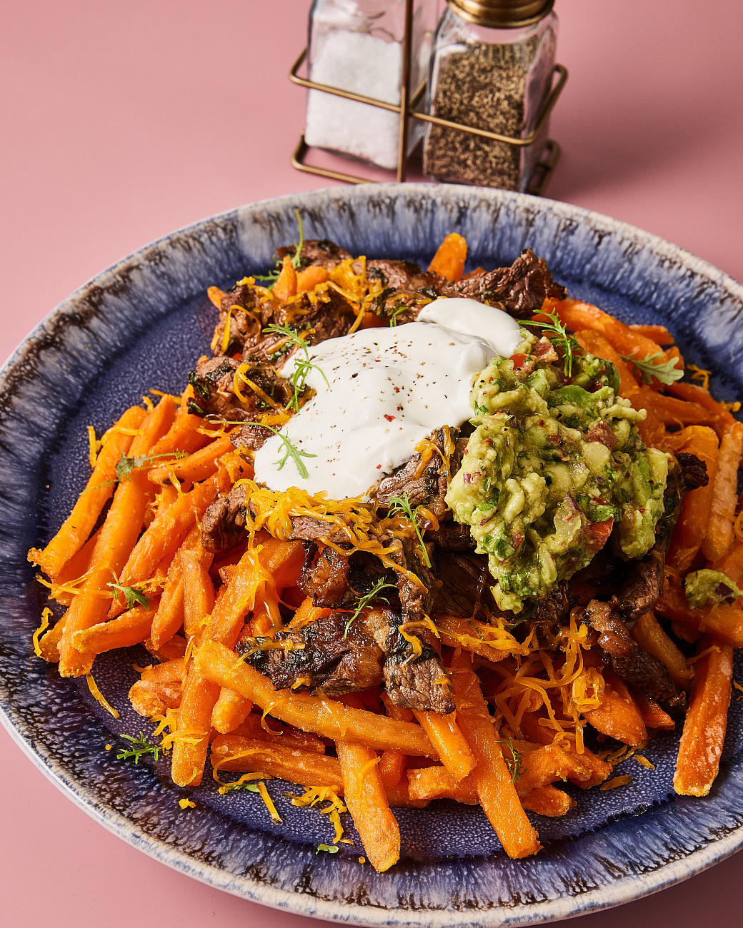 - Выкладываем в тарелку готовый батат фри, посыпаем тёртым чеддером, затем выкладываем стейки (в нарезке), гуакамоле и сметану. Перед подачей украшаем рубленой зеленью и копчёной паприкой.