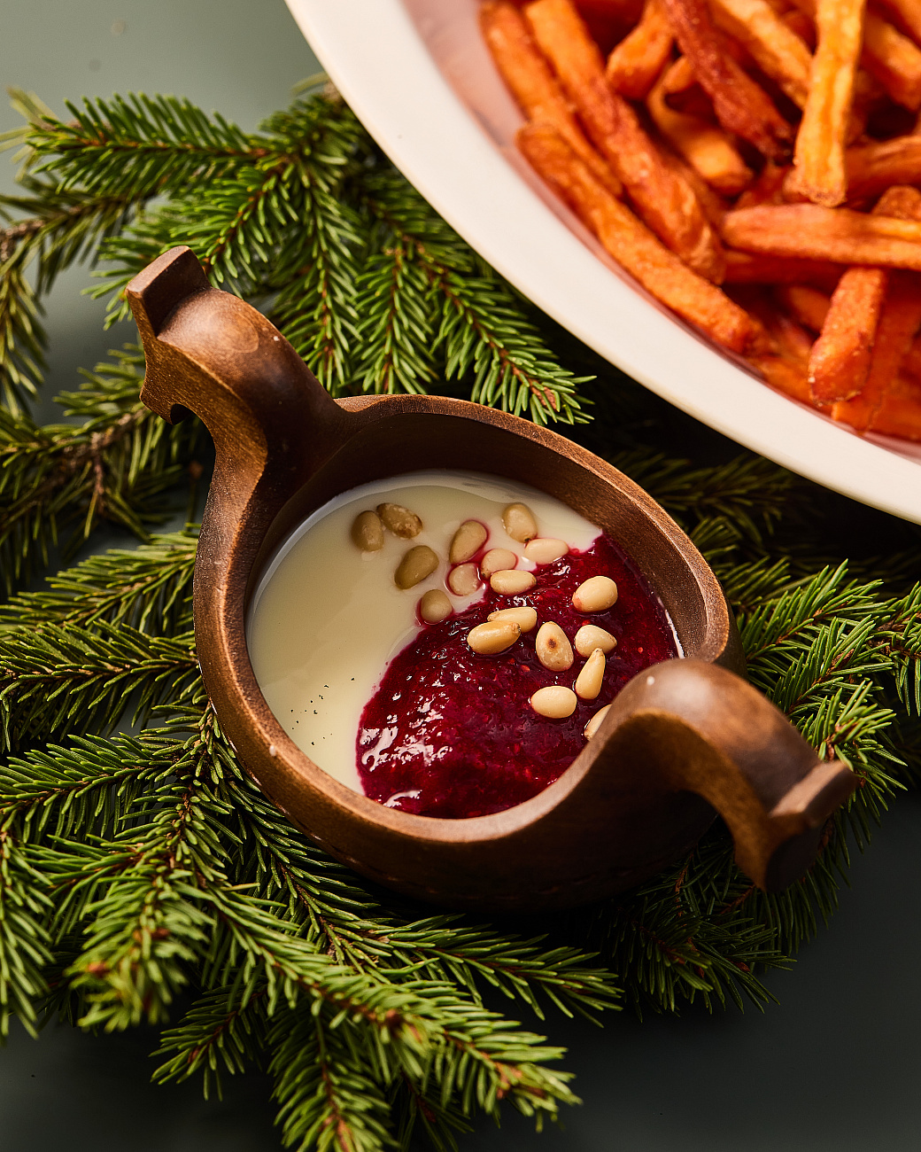 - Аккуратно выкладываем в соусник по одному краю — ягодную массу, по другому краю — сгущённое молоко. Посыпаем кедровыми орехами и подаём с горячим бататом фри.