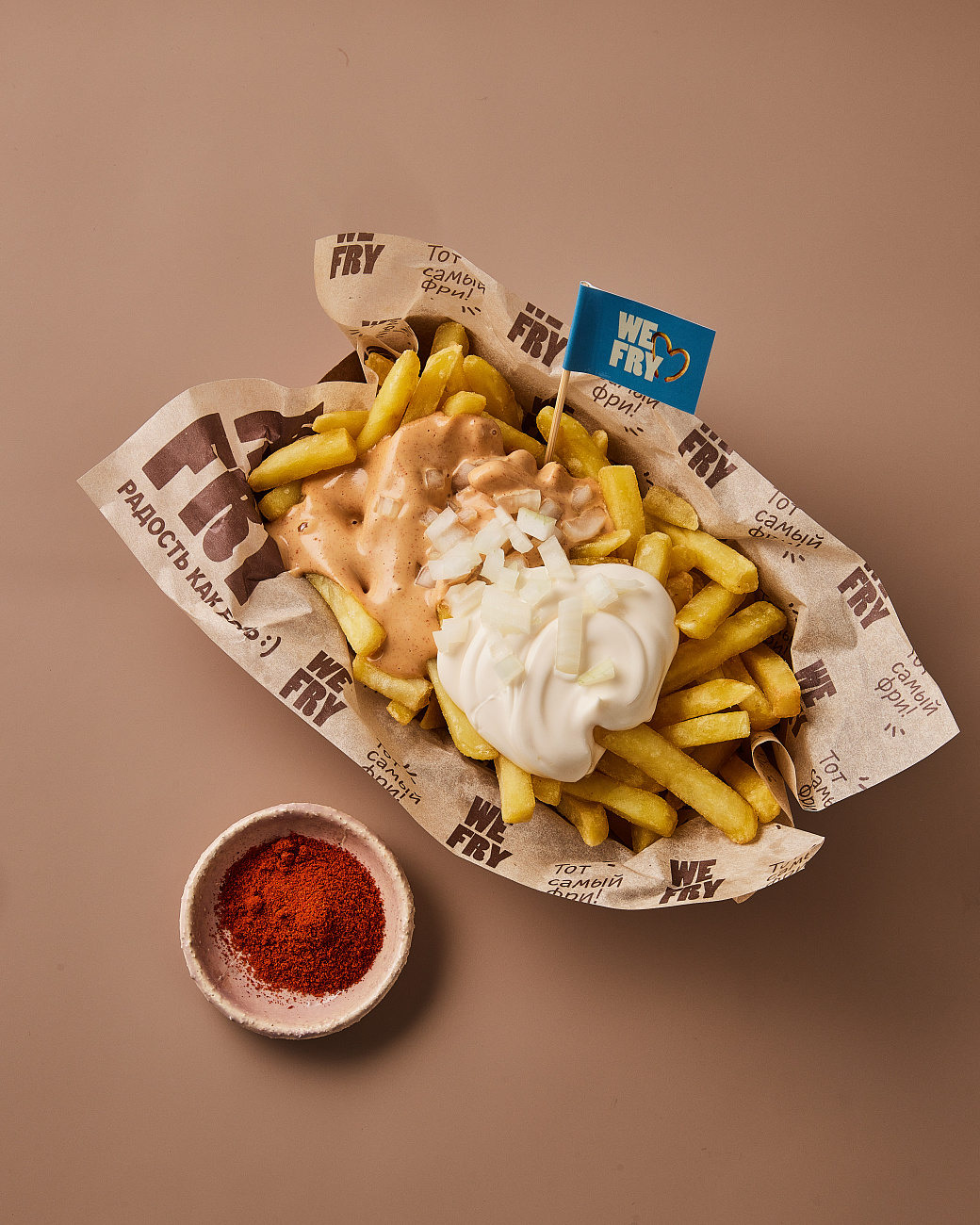 - Подаём горячий картофель фри с майонезом и арахисовым соусом, сверху посыпаем луком.