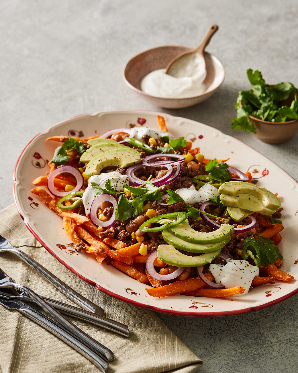 Выкладываем в глубокую тарелку горячий батат фри, затем добавляем фарш с фасолью и кукурузой, сверху – кольца лука и авокадо. Украшаем крупными веточками свежей кинзы, в виде соуса добавляем греческий йогурт. По вкусу приправляем перцем чили.