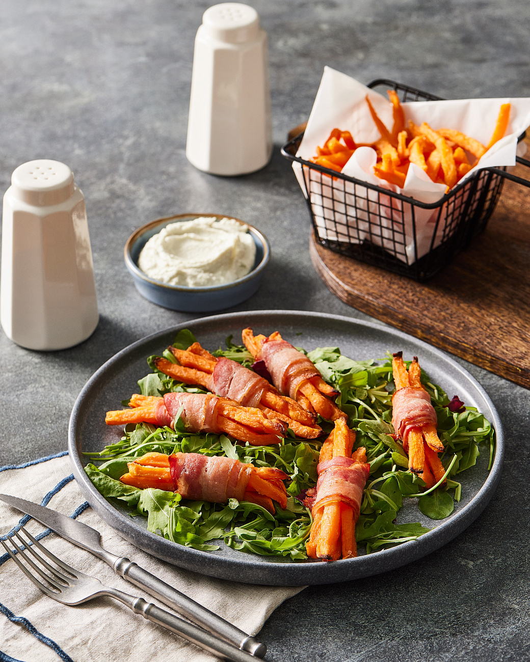 - Подаём на плоской тарелке, на подушке из свежих салатных листьев. Соус подаём в отдельном соуснике. Для лучшего контраста с горячим бататом фри соус можно немного подержать в холодильнике.