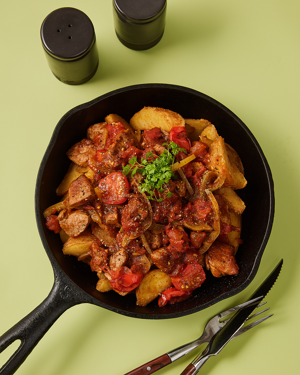 Смешиваем готовые картофельные дольки, обжаренные свинину и болгарский перец. Добавляем половинки черри, протёртые томаты, хмели-сунели, соль и прогреваем полученную массу на сковороде с закрытой крышкой 2 минуты.