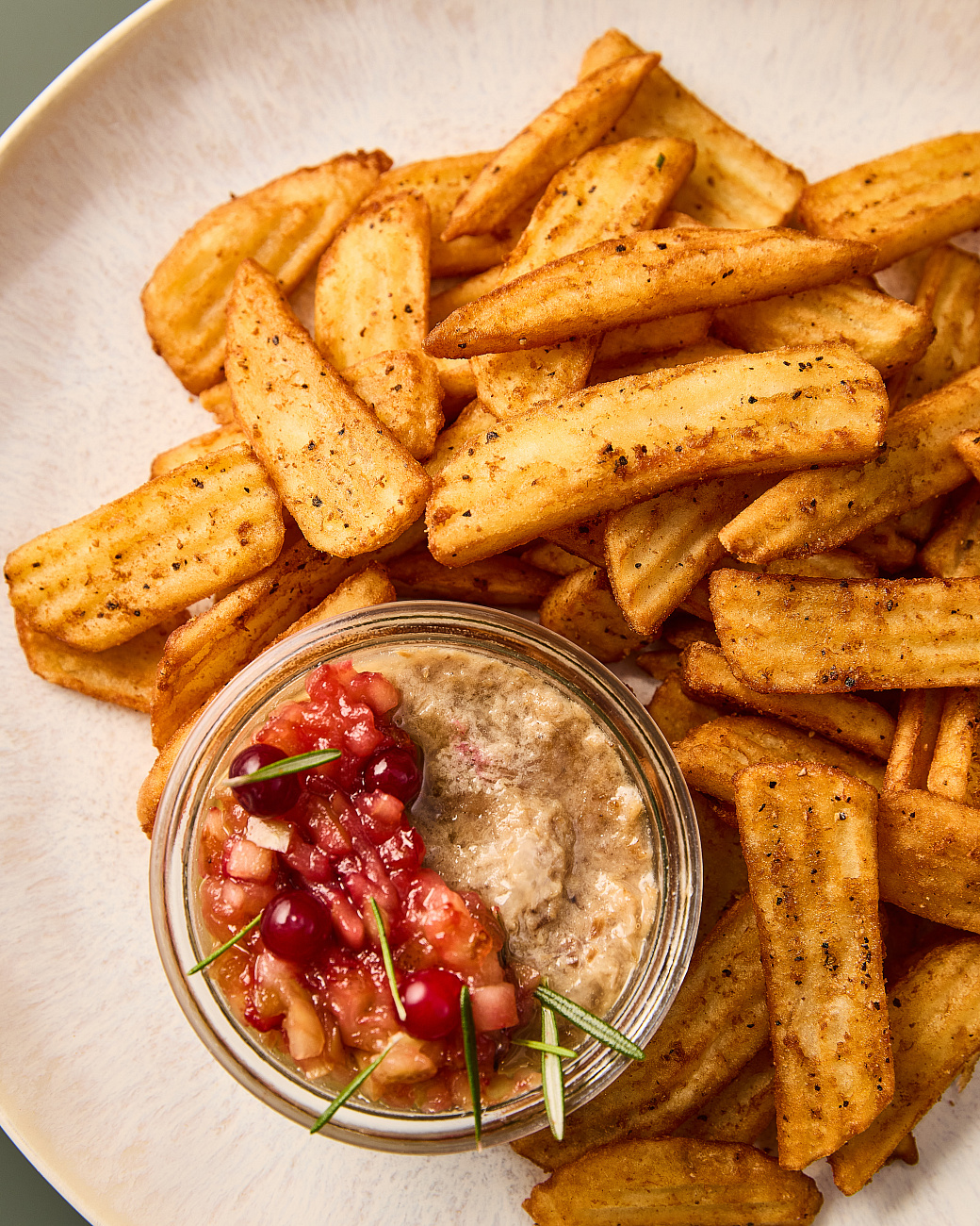 - Подаём горячие стрипсы с риетом, декорированным в соуснике обжаренными яблоками и веточками розмарина.
