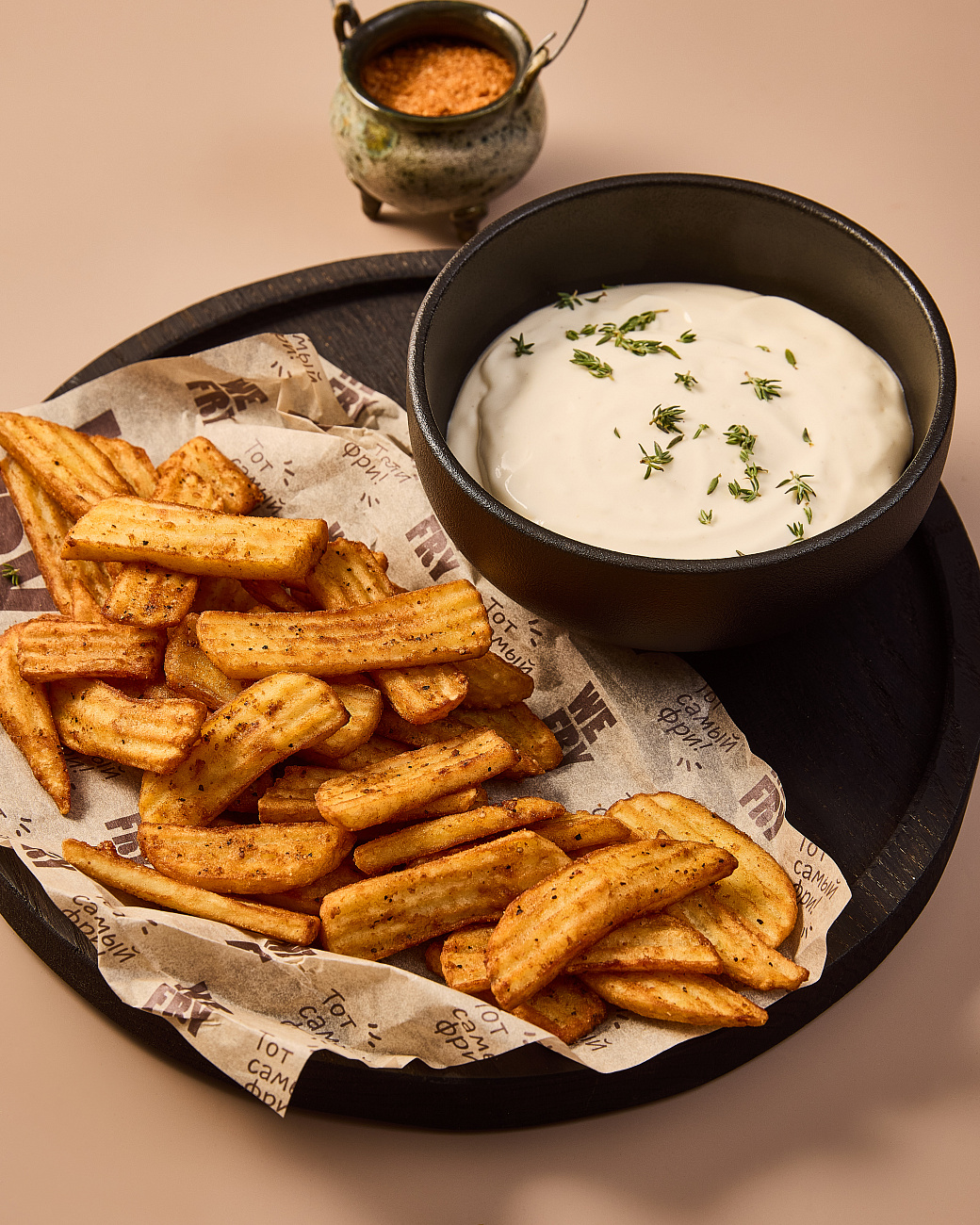 - Подаём с горячими картофельными стрипсами, по желанию украшаем рубленой сезонной зеленью или мелкими веточками розмарина.